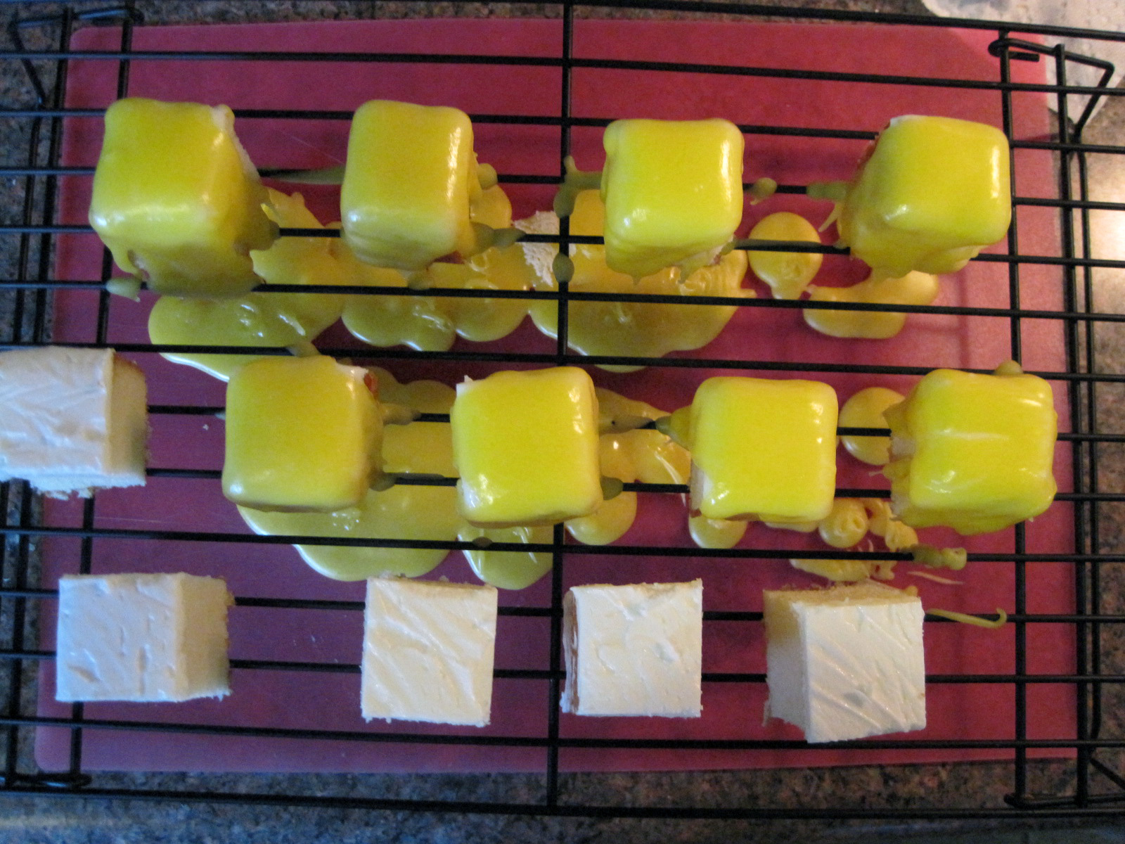 I ran the serrated knife under warm water and wiped it dry before cutting. Also, I just free-hand cut. I'm not too particular, but feel free to measure it out. I suppose my petite fours are probably larger and taller than "regular" petite fours. Oh well.Then I placed a few cut pieces of cake on a cooling rack over a cutting board (are they still called boards when they're plastic?)